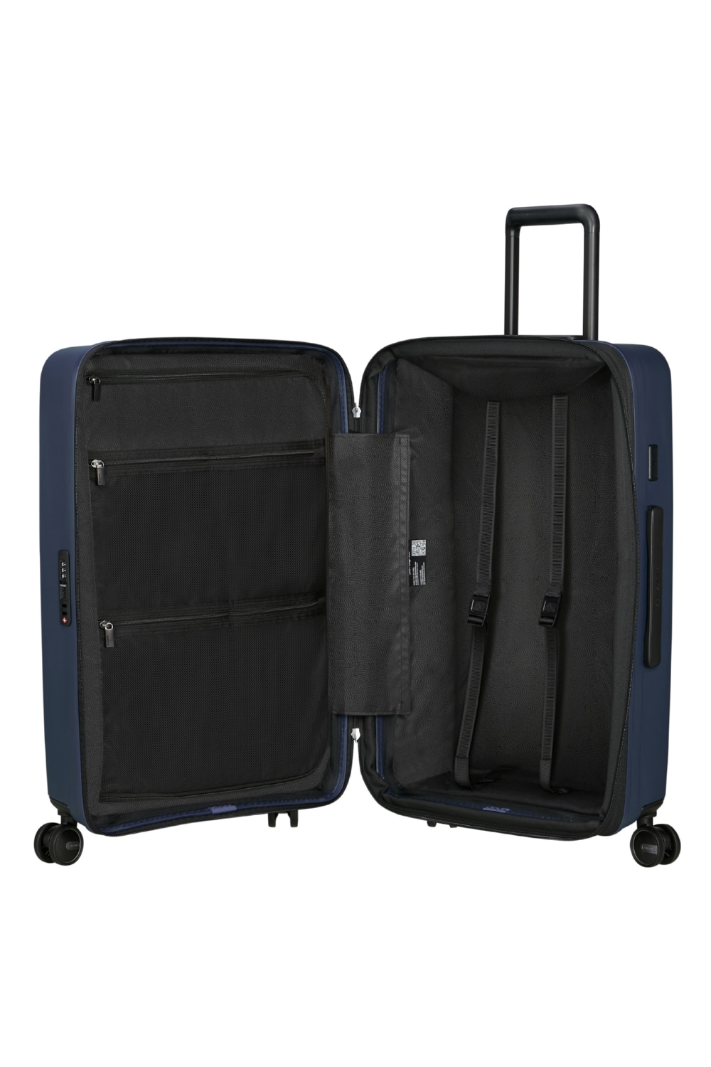 Внутрішній простір валізи зручно організований за рахунок фіксованої перегородки з двома відділеннями на блискавці зверху та пакувальних ременів, які регулюються по висоті. Підкладка повністю знімна та може бути знята вручну.