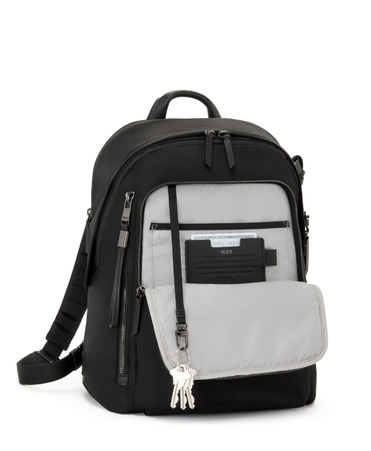 - М’які регульовані лямки рюкзака з D-подібним кільцем і петлею, сумісні з вибраними аксесуарами TUMI+*;